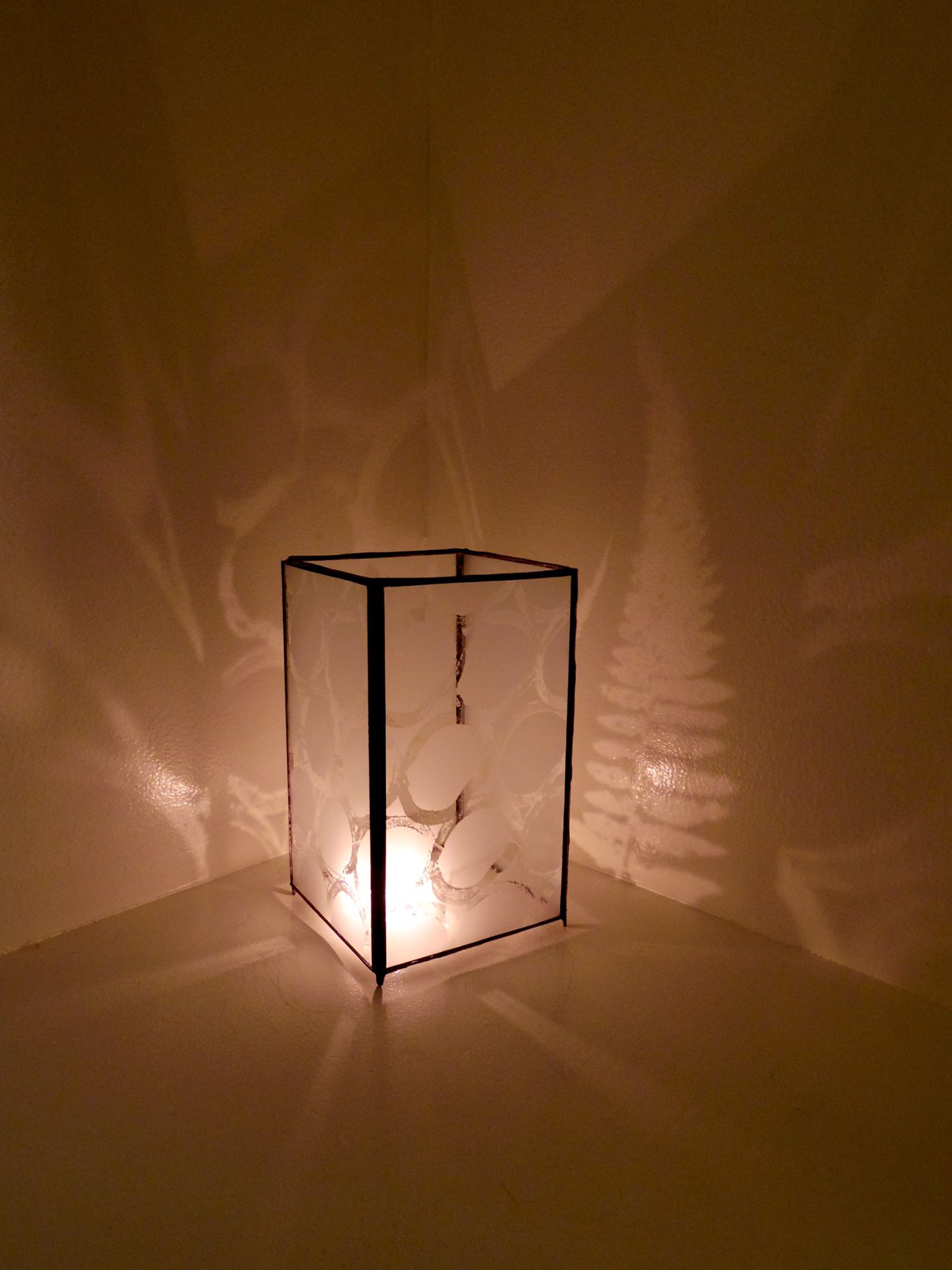 ステンドグラスの技法で組み上げるガラスには、竹田の植物や竹が写し彫られています。
